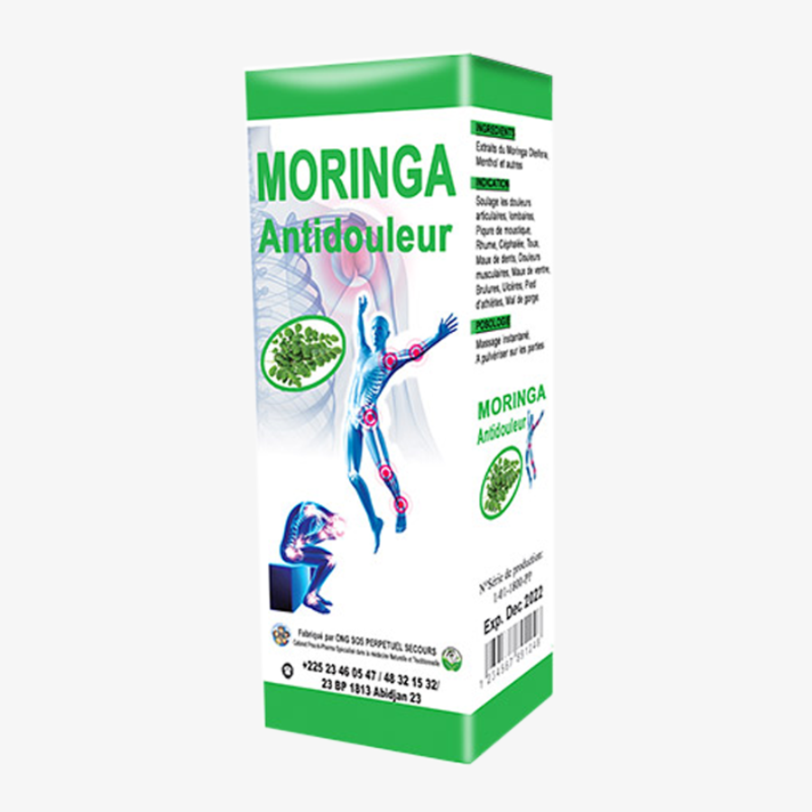Moringa Antidouleur soulage les douleurs articulaires, lombaires, piqûre de moustique, rhume, céphalée, toux, maux de dents, douleurs musculaires, maux de ventre, brûlures, ulcères, pied d’athlètes, mal de gorge.